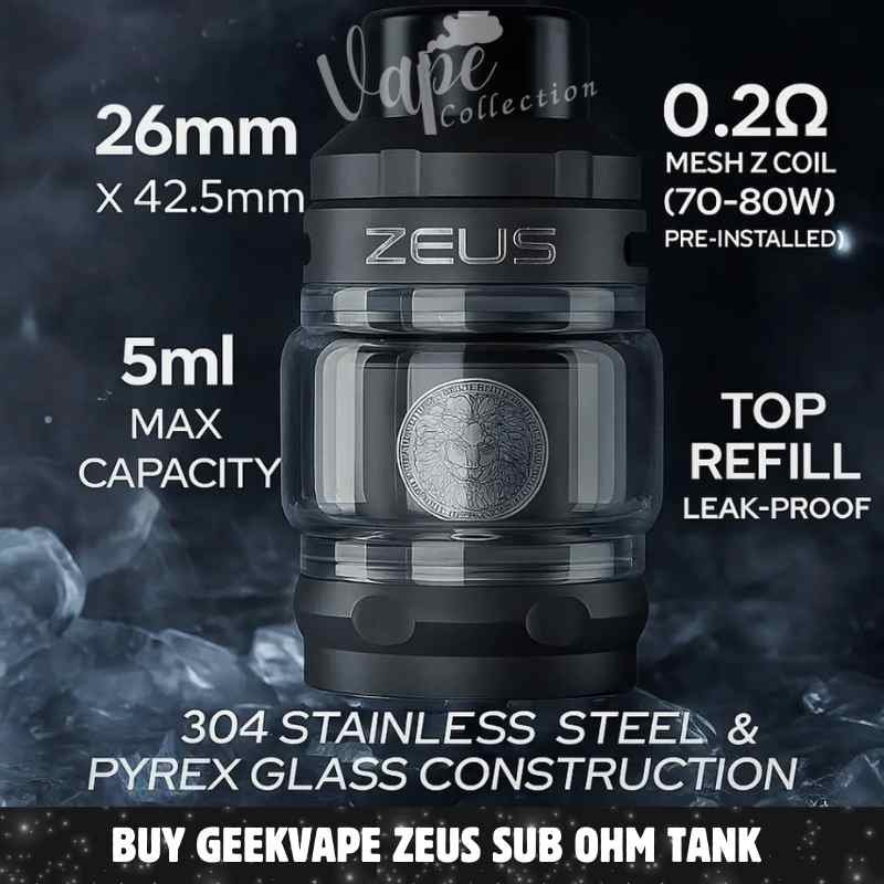 The tank is compatible with Geekvape’s Z Series Mesh Coils, known for their quick heating, rich flavor output, and long lifespan. Made from durable stainless steel and Pyrex glass, the Zeus Sub Ohm Tank combines toughness with elegance, making it perfect for both high-wattage enthusiasts and everyday vapers in Dubai.
