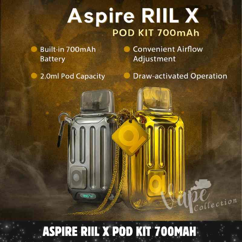 The Aspire Riil X Pod Kit 700mAh features a 700mAh battery, providing long-lasting performance for your vaping needs.
